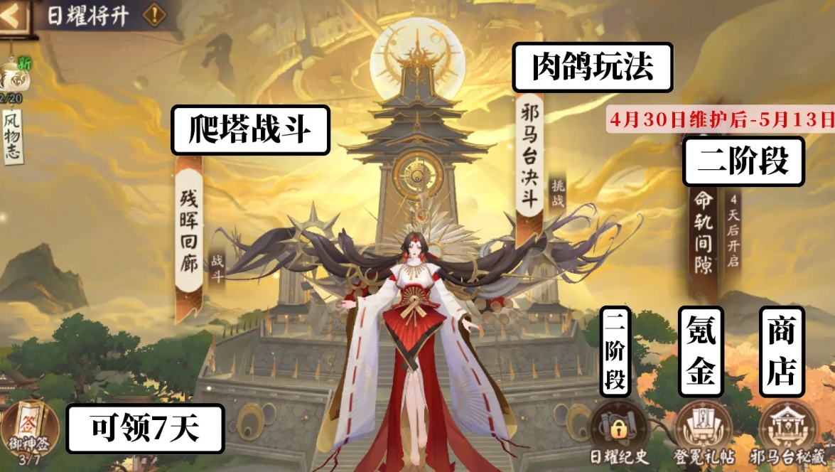 阴阳师开启全新版本活动日耀将升,这是卑弥呼的伴生活动,包含多个不同玩法,并且活动分为两个阶段,一直持续到5月13日。