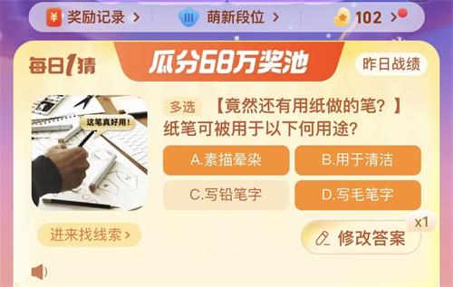 以上就是纸笔可被用于以下何用途问题的答案一览,玩家可进入每日一猜答题界面进行答题。