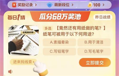 纸笔可被用于以下何用途是淘宝每日一猜今日的问题,许多的小伙伴是不是还不知道纸笔可被用于以下何用途问题的答案是什么呢?下面小编就给大家带来了此问题的答案一览,小伙伴们快来看看吧。