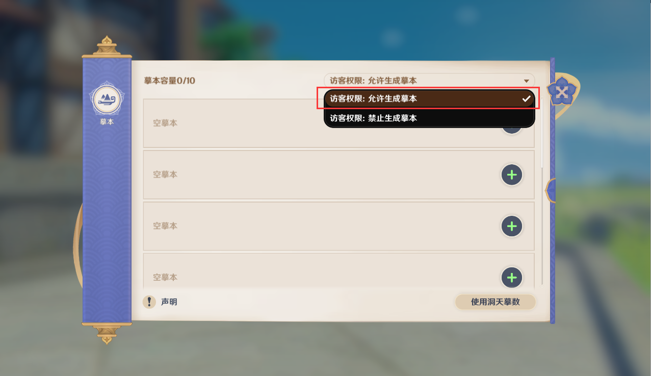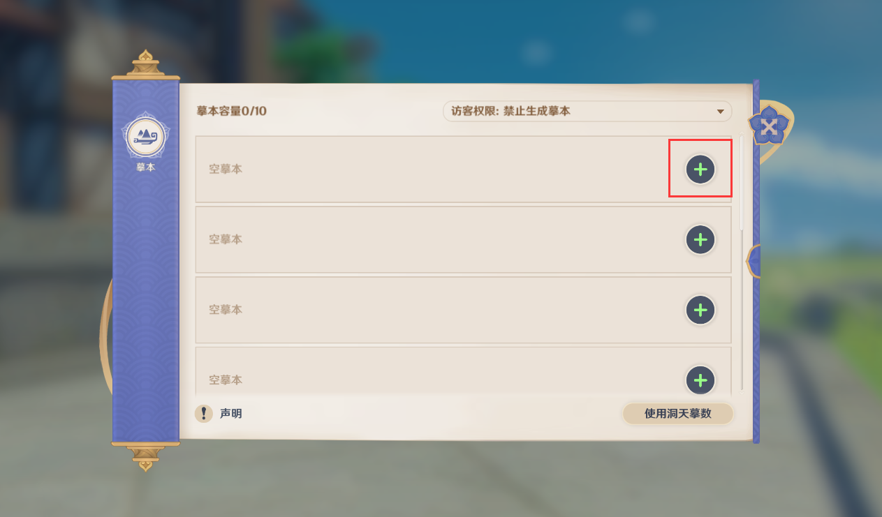 1、进入尘歌壶后,选择右上角的[洞天宝鉴]图标,PC端点击F6。