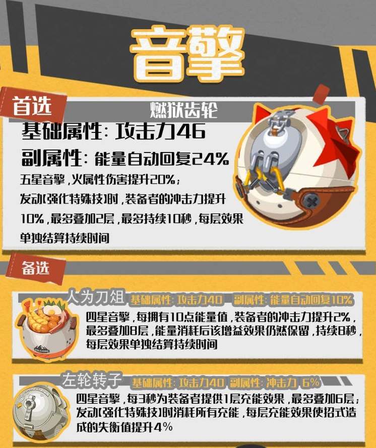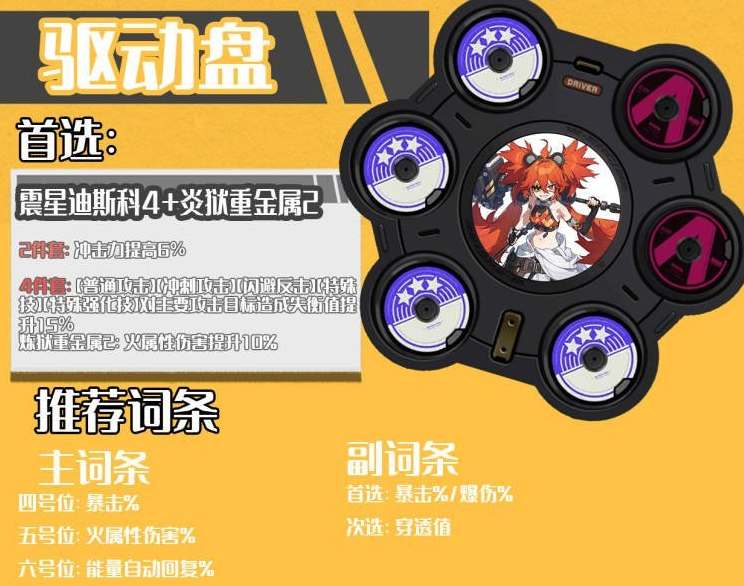 驱动盘主词条4号位选择暴击百分比,5号位选择火属性伤害,6号位选择能量自动回复百分比。