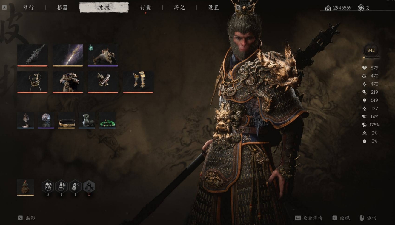没了磬锤的棍势获得识破打起来没那么爽快流畅,所以披挂跟精魄我选择能攒棍势的用,地狼跟藏风两件让混铁棍打起来棍势也不会太缺,头饰三山,手臂赭黄,再打出boss小硬直的情况下,我四豆戳棍都是不打凤穿花的,选择蓄力直出,吃上赭黄的暴击率加成。