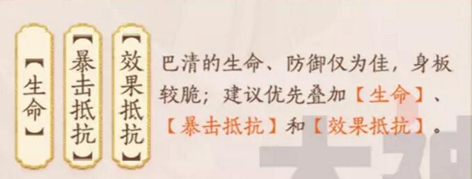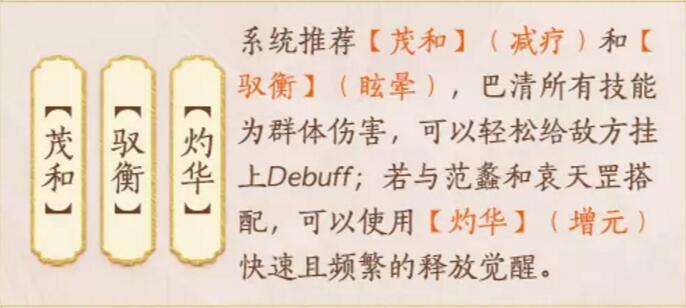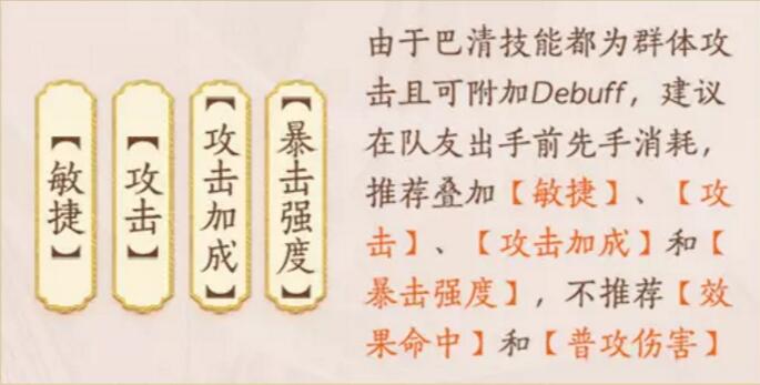 推荐巴清的特点是群体攻击伤害系数高,需要群攻型输出。巴清更适用于群体型副本和PVP,单体BOSS不建议带巴清。