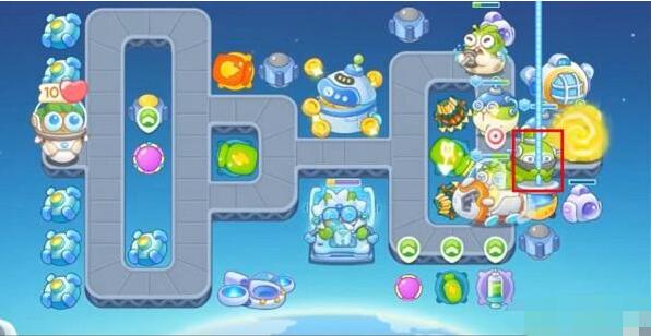 3、然后在这一关中会出现绳索兔,绳索兔出现我们直接集火消灭它,再利用后面的塔开图,如下图所示。