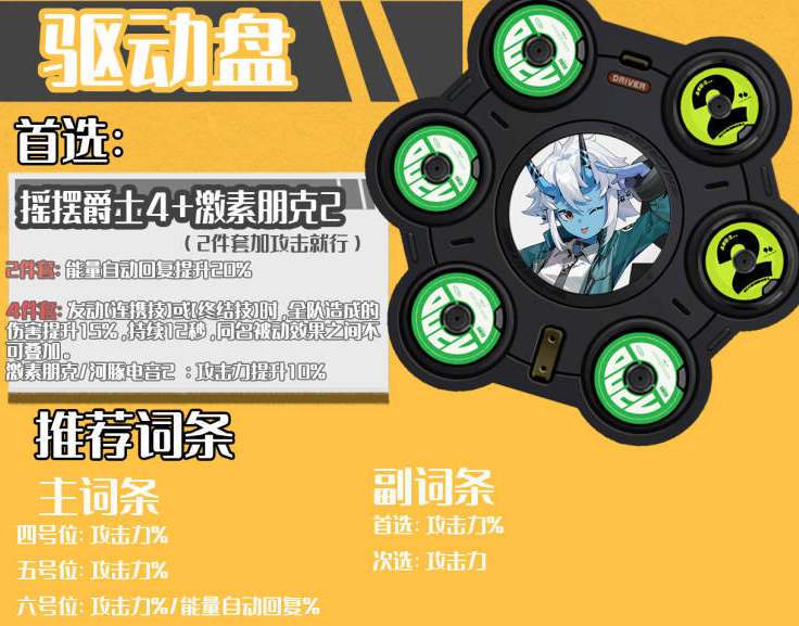 驱动盘主词条4号位、5号位都优先选择攻击力百分比,6号位也可以选攻击力百分比,或者是能量自动回复。