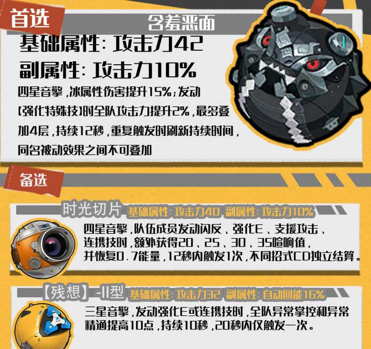 专属音擎【含羞恶面】,提供攻击力和攻击力百分比加成。强化效果中可以提升冰属性伤害,还可以给队伍整体提供攻击力加成。
