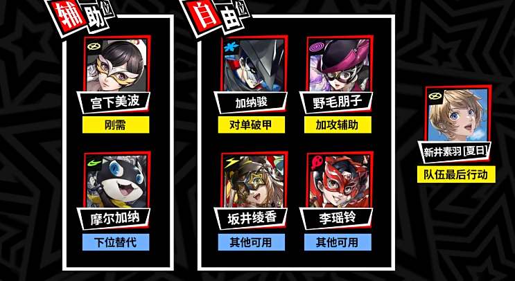 自由位可以在野毛朋子、加纳骏、坂井绫香、李瑶玲几个角色之间选择,具体如何搭配根据玩家自己持有和养成的角色来决定即可。