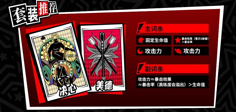 2、套装推荐选择决心以及没得,主词条生命值、攻击力、暴击效果以及暴击率。副词条优先攻击暴击、暴击率,其次生命值。