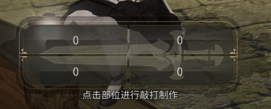 作业台上的数值表示部位的热度。点击4个区域中的任意一个可发动大力捶打,根据热度同时提升进展与品质。