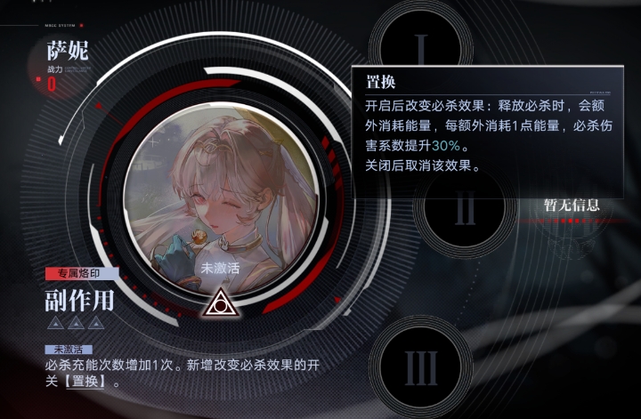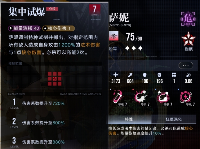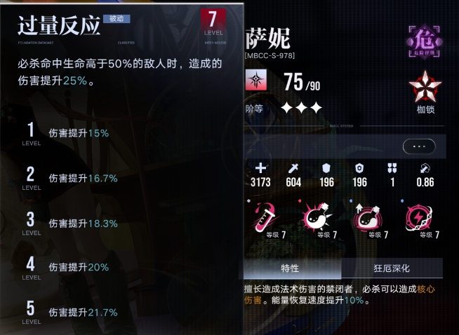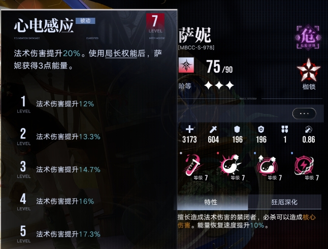 本篇为大家分享的是无期迷途的新干员萨妮的疑凶追影试玩关打法,萨妮是危级的异能角色,可以对敌人造成法术伤害,技能设计还不错,必杀点到7级就能有1200%的倍率,并且在必杀命中生命高于50%的敌人时伤害还能提升25%,被动自带回能,搭配充能是很不错的玩法。