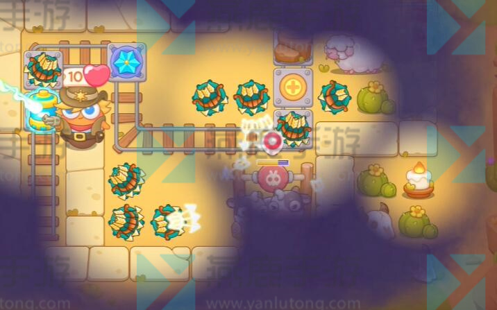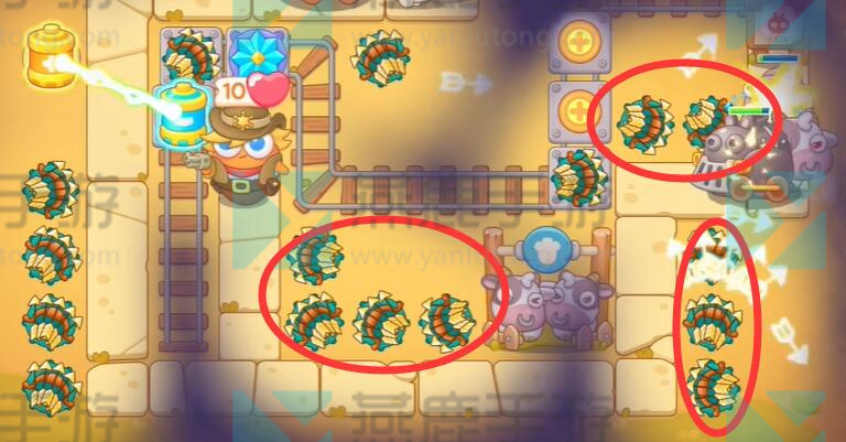 7、在最下面的奶牛这里会有很多的牛出现,在其附近摆放一些弓箭可以将其打掉。