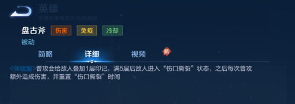【体验服】:普攻会给敌人叠加1层印记,满5层后敌人进入“伤口撕裂”状态,之后每次普攻额外造成伤害,并重置“伤口撕裂” 时间。