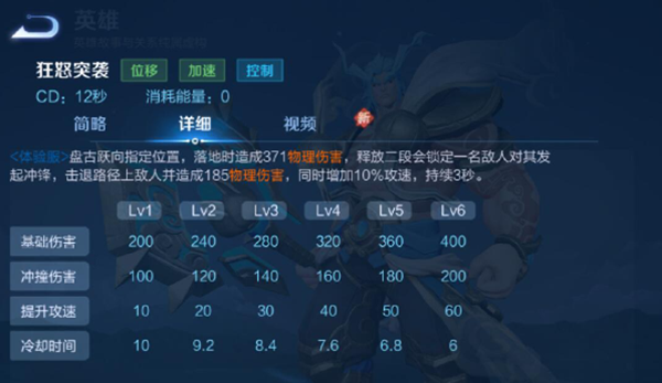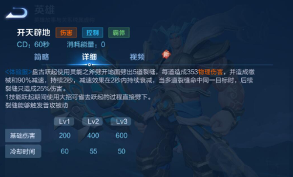 【体验服】:盘古跃向指定位置,落地时造成751物理伤害,释放二段会锁定一 名敌人对其发起冲锋,击退路径上敌人并造成375物理伤害,同时增加60%攻速,持续3秒。