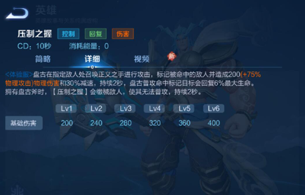 【体验服】:盘古在指定敌人处召唤正义之手进行攻击,标记被命中的敌人并造成663物理伤害和30%减速,持续2秒,盘古普攻命中标记目标会回复6%最大生命。拥有盘古斧时, 压制之握会缴械敌人,使其无法普攻,持续2秒。