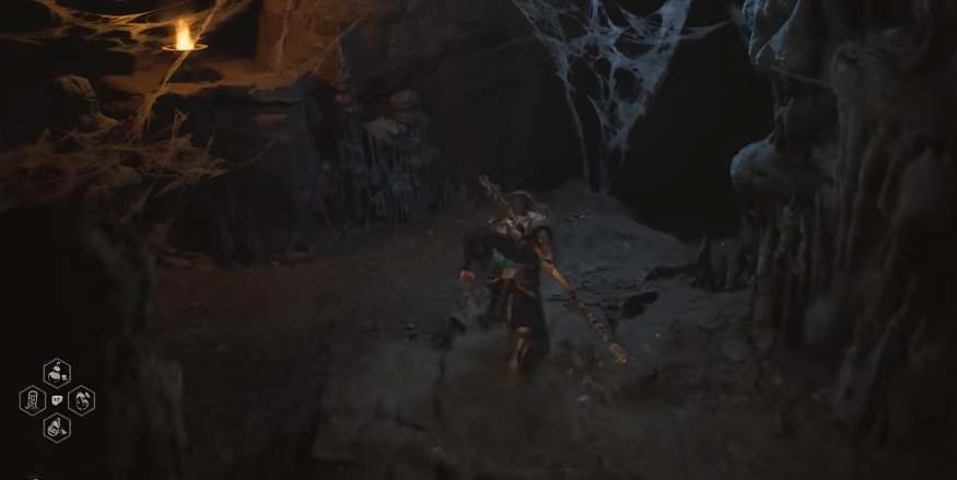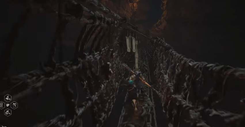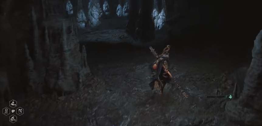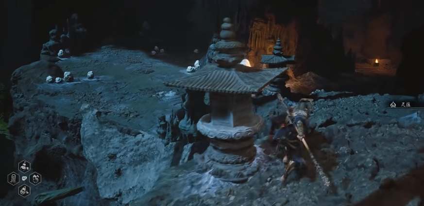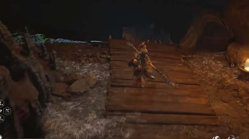 从盘丝洞上层的土地庙触发,沿着右侧的道路走。在有火盆的木板位置跳下去,往前走会来到一片有很多蜘蛛茧的地方,穿过这片区域。