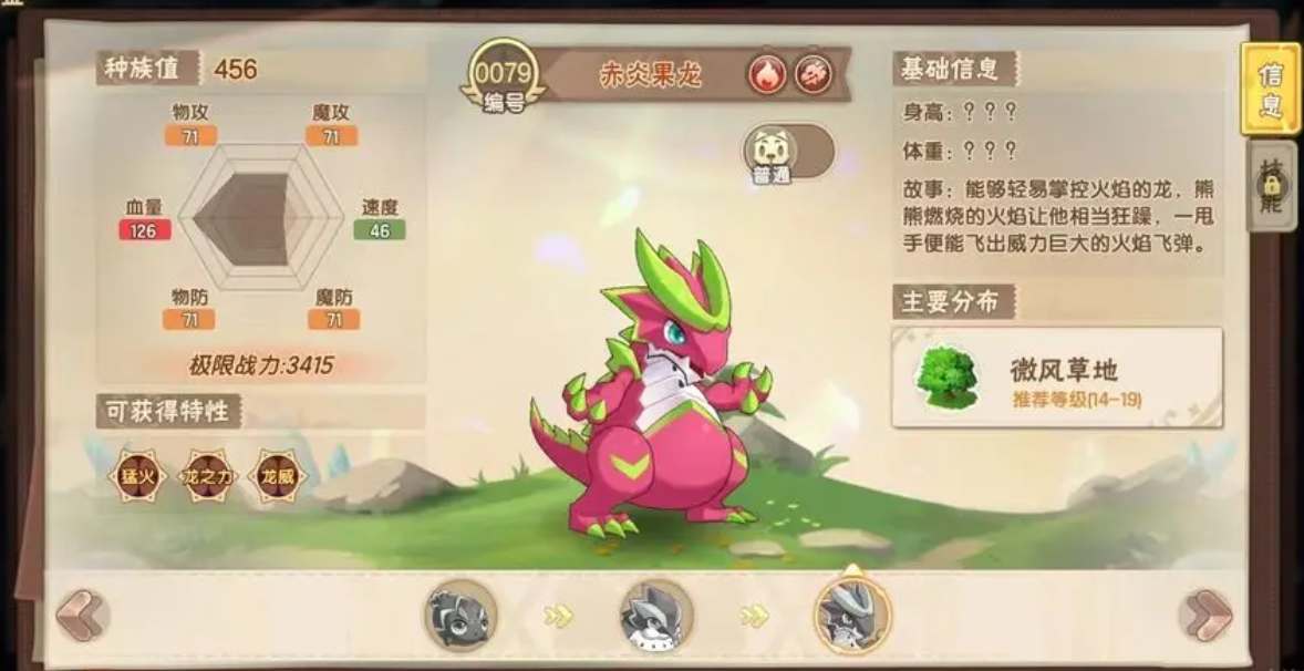 2、炎果龙:拥有超强续航,属性五边形战士。使用龙系技能恢复自身8%生命值,种族值高而且前期容易获取。