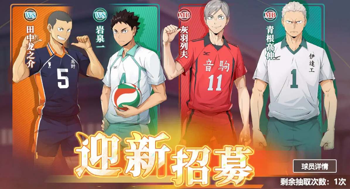 新手池的SSR角色有「田中龙之介」、「岩泉一」、「灰羽列夫」、「青根高伸」。