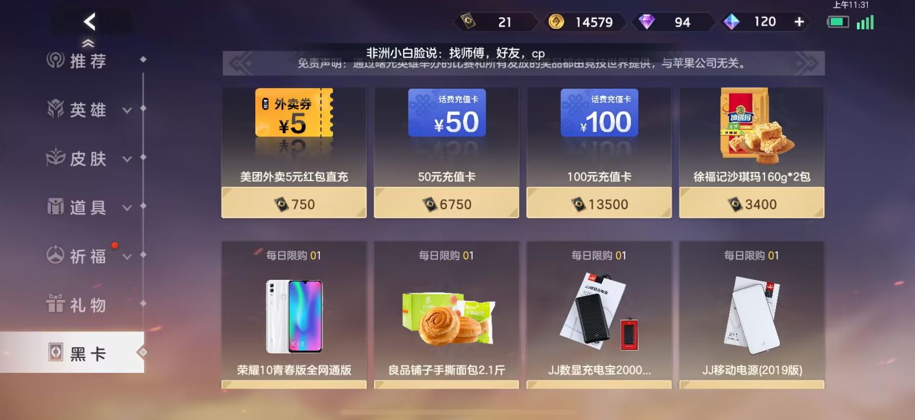 曙光英雄黑卡可以用来兑换许多奖励,包括英雄和英雄皮肤,甚至是话费充值卡和手机,只要黑卡数量足够都是可以兑换的。