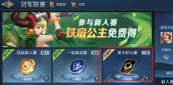 找到主界面的冠军联赛,接着点击黑卡积分赛,玩家可以在黑卡积分赛中获得黑卡。黑卡赛有三种场次,分别是新手场,中级场和高级场,场次越高,奖励越高。