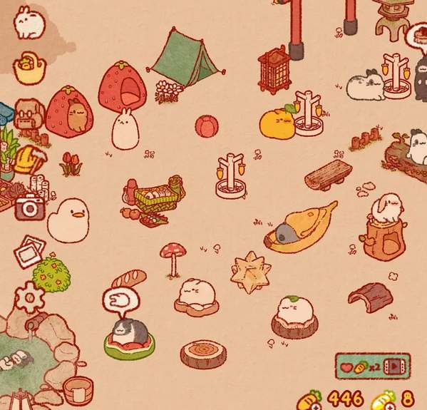 1、玩家在庭院中摆放一些道具,可以吸引一些兔子来拜访庭院,每隔一段时间去看一下就可以了,点击兔子可以进行互动增加好感度。