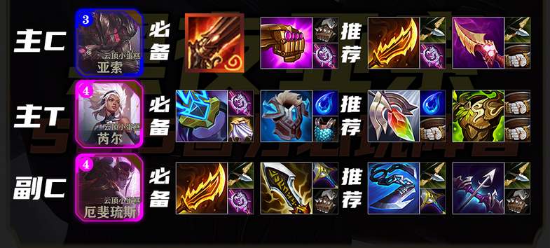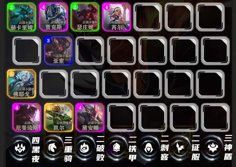 2、羁绊构成:4黑夜3重骑2破败2铁甲2刺客2征服3神盾;