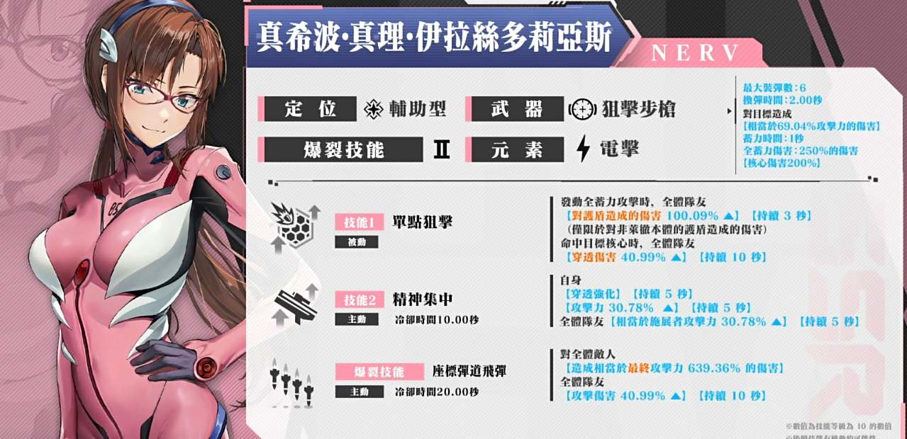 真希波的定位是辅助型妮姬,武器是狙击步枪,元素为电击属性。