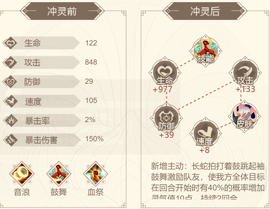 长蛇前期可以给阵容带来足够的灵气值,灵气值恢复能力的镜灵比较少,但这又是必备的角色,所以有的话就练吧。但是长蛇不用投入过多的培养,练到40级 就已经足够了,但是练度也不能太低了,容易被秒杀。