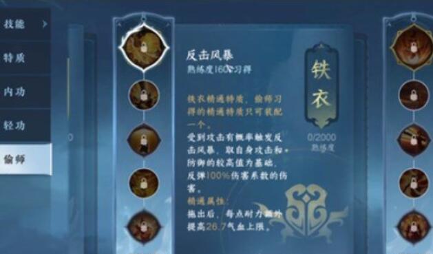 血河pvp偷师可以选择【铁壁】和【反击风暴】,既可以增加自己的坦度,而且反击风暴这个技能可以100%反弹伤害,在游戏中非常好用。