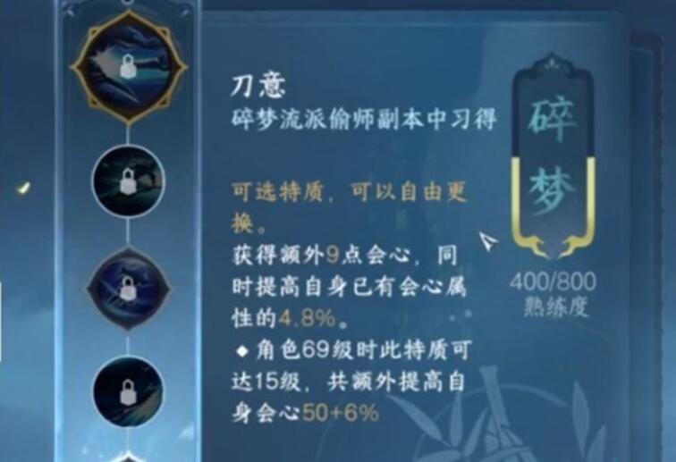 血河pve偷师推荐选择【刀意】,血河作为战士,自身需要的伤害肯定是越多越好,所以碎梦非常合适血河偷师,可以增加不少会心伤害。