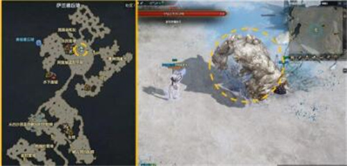 1、玩家需要在地图上来到村庄,附近一颗大树的周围,向地图的正上方走就可以看见了世界boss盐巨人了。