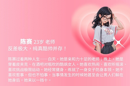 3、陈赛:她是一位23岁的老师,她自身反差极大,是纯真和酷帅并存的存在。
