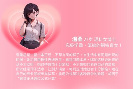 4、温柔:她是一位27岁的理科女博士,是一位究极学霸并且还是一个笨拙的钢铁直女。