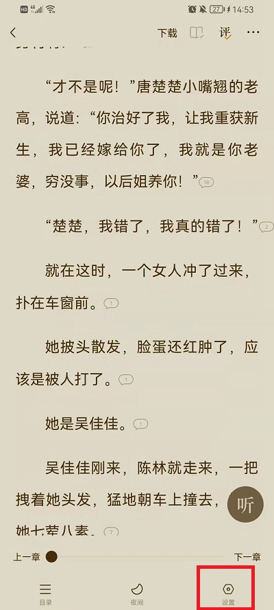 2、我们在阅读界面中点击屏幕的中间,接着就会弹出功能设置页面,我们点击右下角的【设置】。