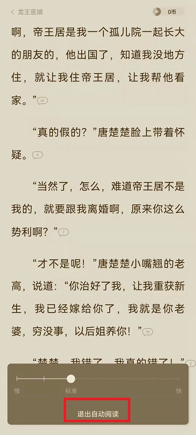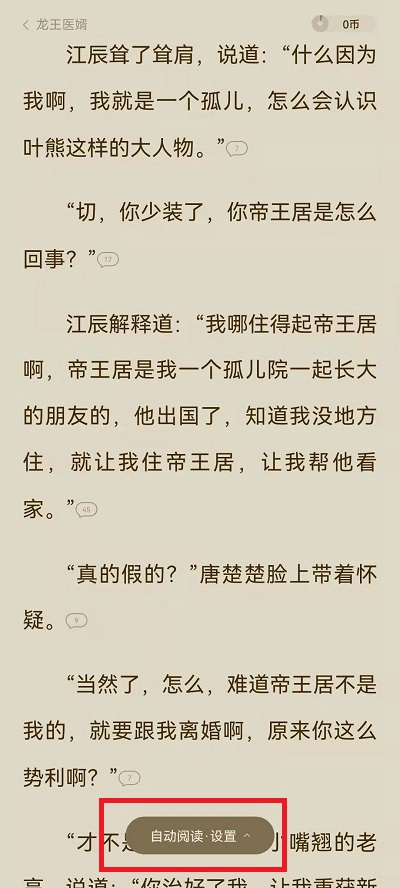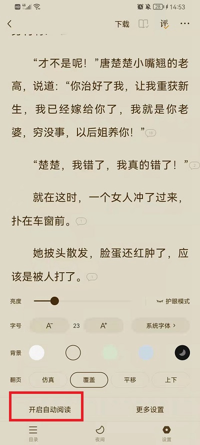 3、接着我们在设置里面选择【开启自动阅读】,然后就会以滚动模式进行阅读了。