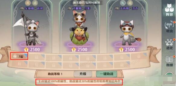 4、多打阿奇古塔开助战位,升级主战位可以上阵更多、更高品阶的猫灵,提升角色属性(助战猫灵30%的属性将转换增加给角色)。