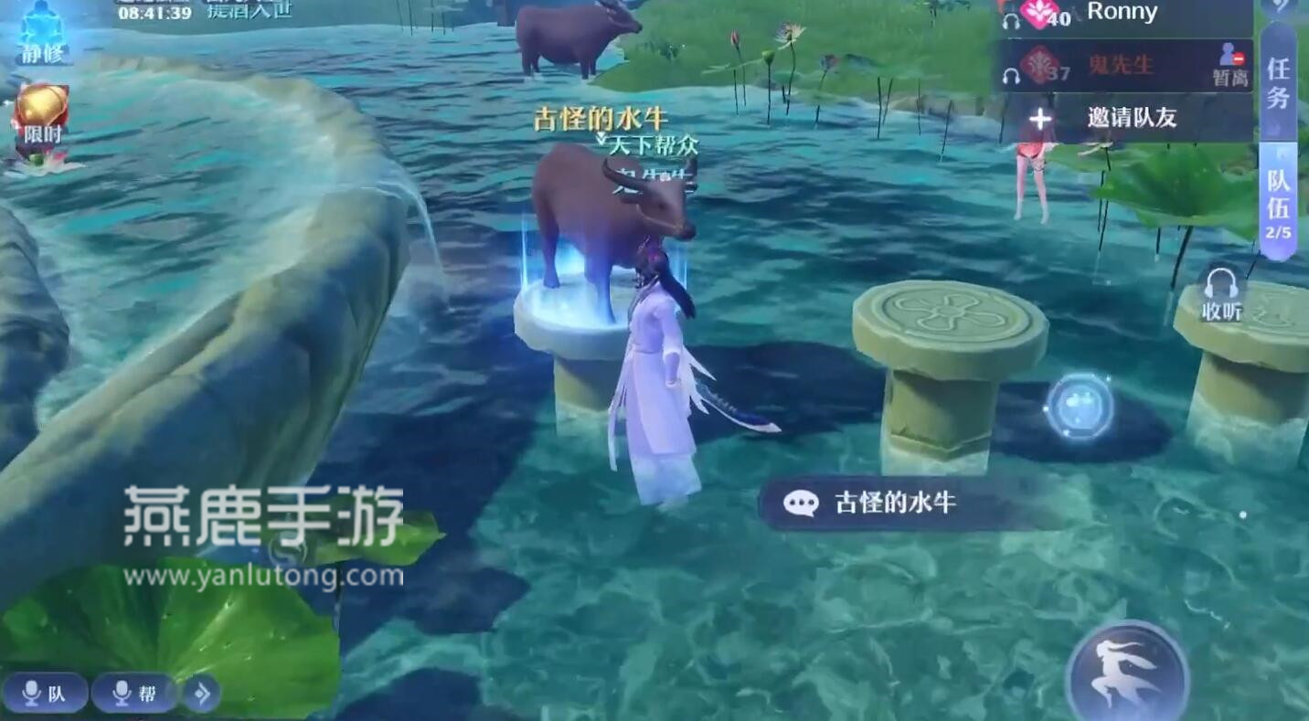 2、然后在水塘旁边找到古怪的水牛,让水牛踹你即可触发;