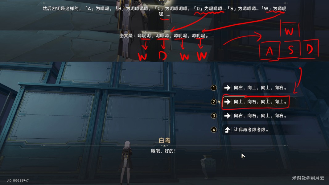 回到遇见机巧鸟的位置,依照机巧鸟给出的密文和密钥(邦布的既视感……),解密文字,并依据文字给机巧鸟指示。