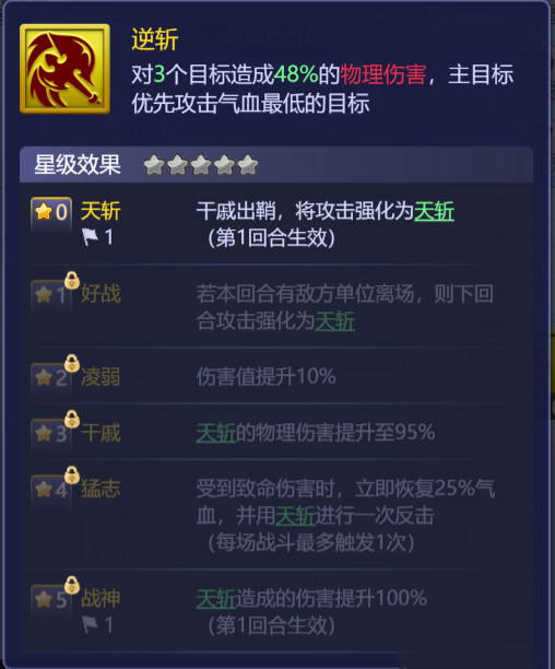 4星:猛志——受到致命伤害时,立即恢复25%气血,并用天斩进行一次反击(每场战斗最多触发1次)