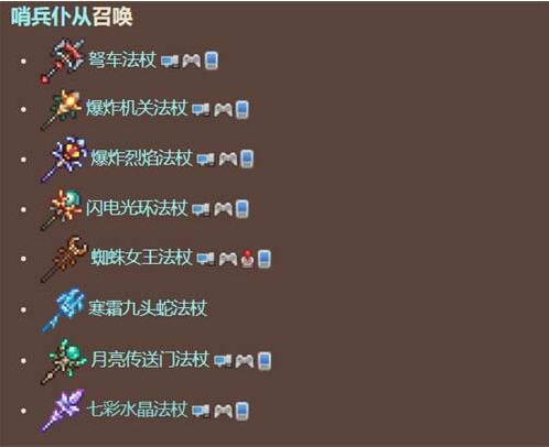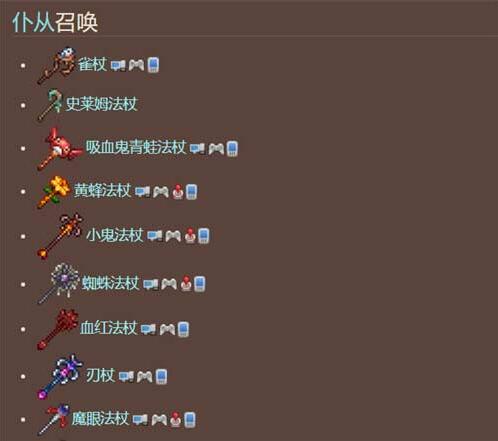仆从召唤类:雀杖、史莱姆法杖、吸血鬼青蛙法杖、黄蜂法杖等。