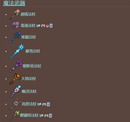 在泰拉瑞亚这款游戏中拥有丰富的武器种类,大致可以分为:近战武器、远程武器、魔法物品、召唤武器和其它武器,有玩家想知道在游戏中的法杖武器有哪些,那么下面就为大家分享泰拉瑞亚法杖大全图鉴,感兴趣的小伙伴快来看看吧。