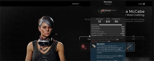 无情长枪属性:伤害13、每秒弹数8.6、弹匣50。理想范围20m、衰减范围45m、最大弹药量250、暴击几率10%、弱点伤害加成+100%、硬直改装0%。无内置突变因子。