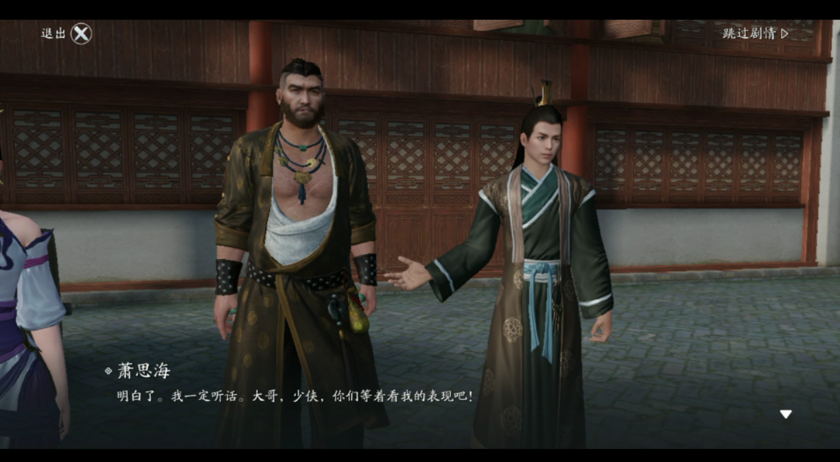 2、点一下自动寻路寻找第二个NPC萧思言,他是阿暖的兄长,给少侠送伞,对话结束可以得到油纸伞表情奖励,之后往前走还可以看见恶霸,触发大隐于市任务。