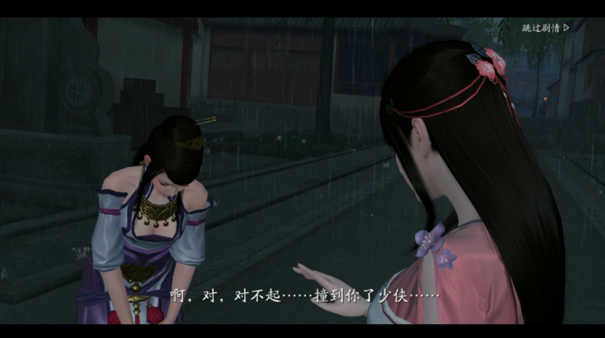 1、首先在江南的聆音楼的路口,可以见到师妹阿暖,之后触发避雨任务。