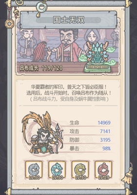 2、完成三英战吕布之后,就能解锁情报19—国士无双。之后就能解锁吕布,在战斗开始的时,能召唤吕布作为随从。
