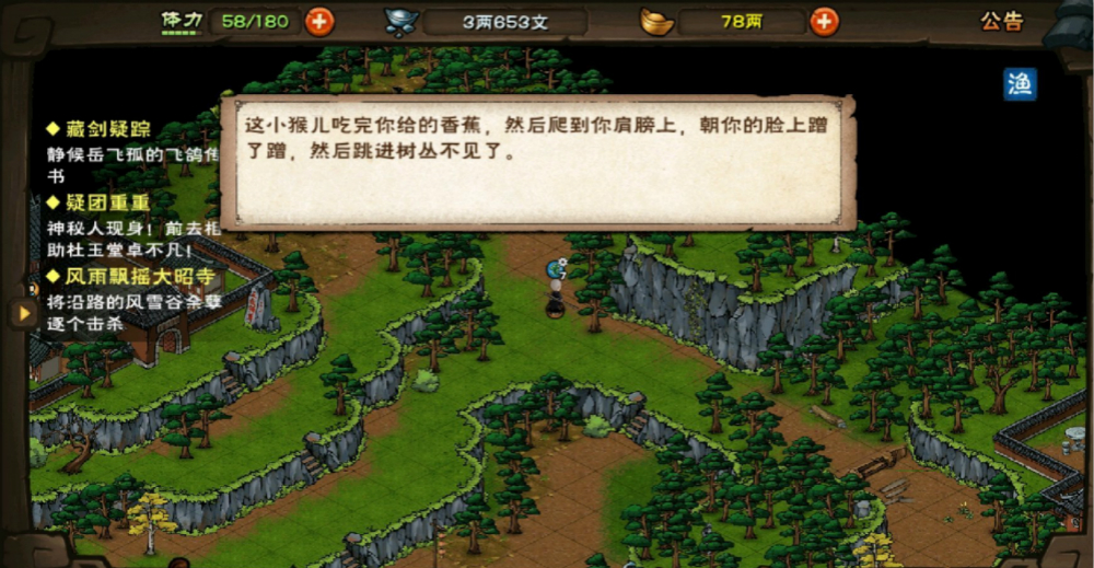 烟雨江湖泰安镇泰来客栈的店小二有一块家传玉佩不见了,原来是被山上的猴子拿走了,那么要怎么拿回来呢?下面小编就向大家介绍下泰安镇家传玉佩任务的通关攻略,一起来看下拿回玉佩的方法吧。