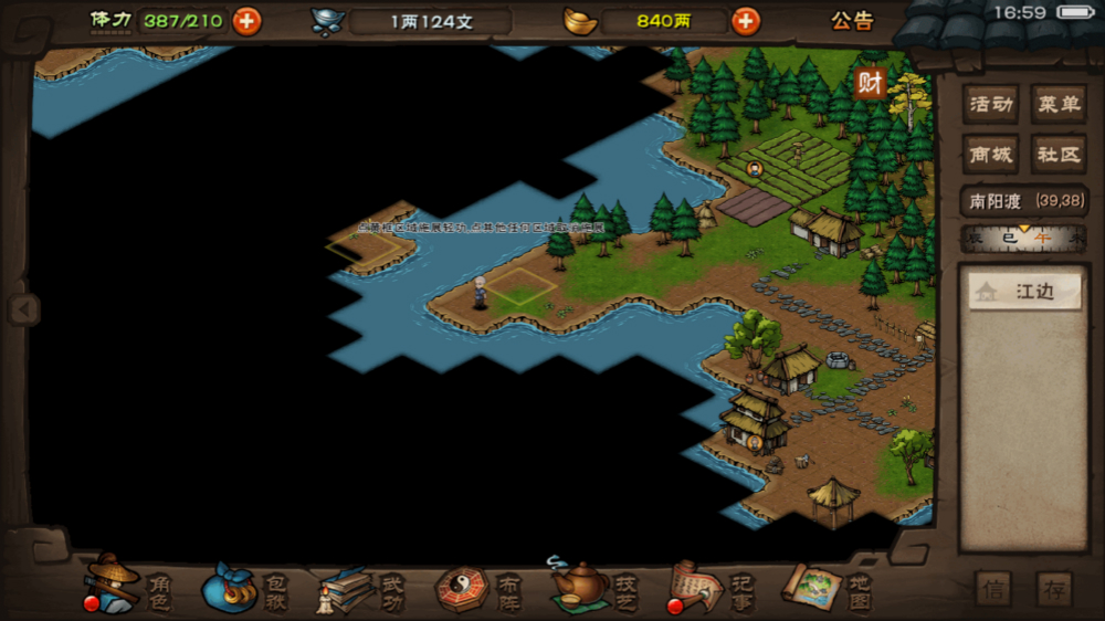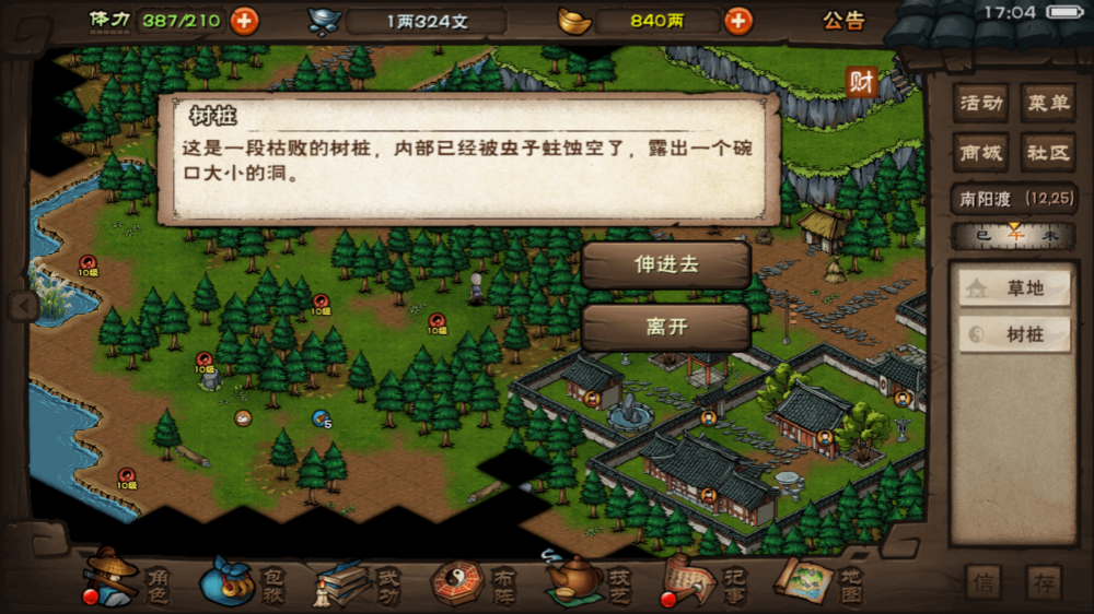 2、推开壁橱,到屋子后面去掏树桩(14,21),得到一把生锈的铁剑