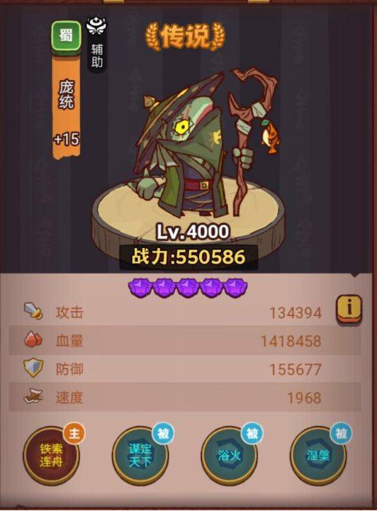 庞统:庞统是蜀国传说品质的咸将,场上位置为辅助,首次阵亡可恢复至满血状态,并附赠减伤效果。