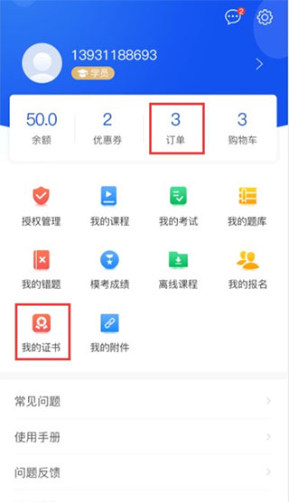 在“我的”进入个人中心页面,点击“证书”“订单”查看。