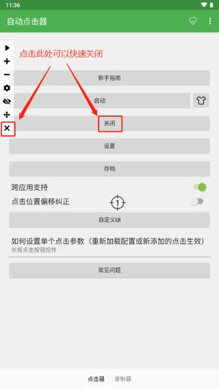 如果有一天突然自动点击器停止了工作,你可以先收回辅助功能权限再重新赋予,试试是否可以使用,如果不可以,那么就果断重启手机吧!