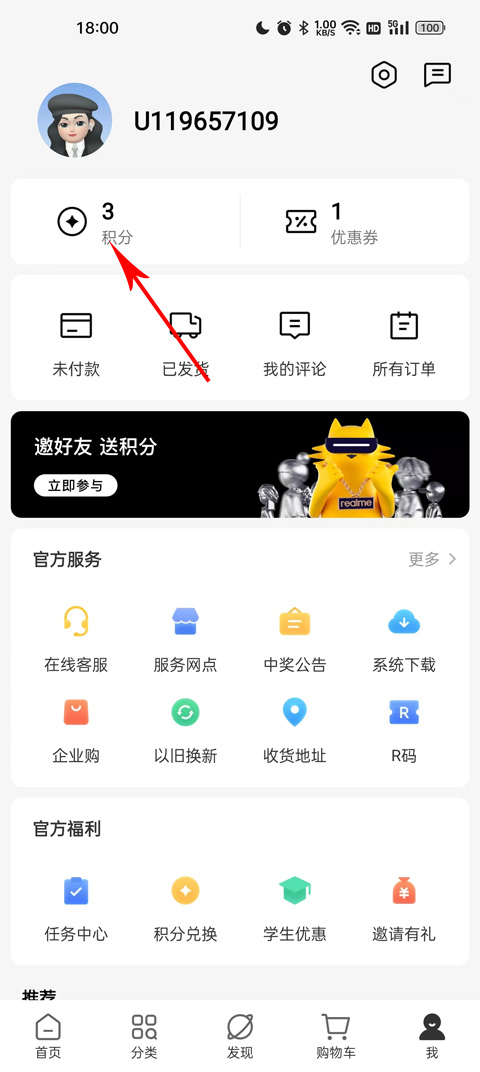 3、进入到我的页面后,点击头像下方的积分进入积分商城。